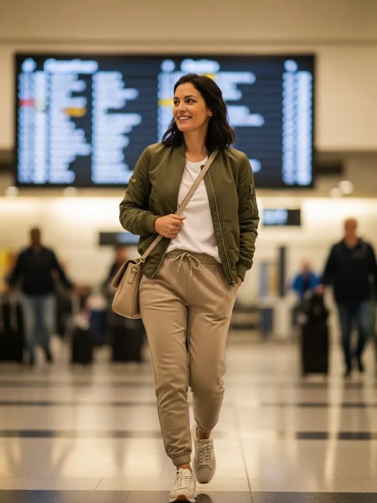 This outfit blends a soft white tee with beige joggers and an olive bomber jacket that adds structure without losing comfort. The neutral sneakers and crossbody bag tie everything together in a clean, everyday palette. It is relaxed yet surprisingly polished which makes it perfect for long travel days.
