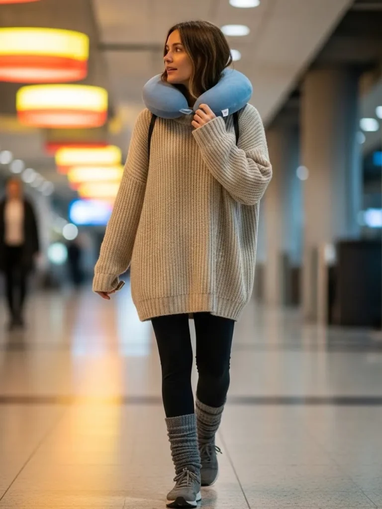 This outfit centers around an oversized beige knit sweater paired with black leggings and soft grey leg warmers for added warmth. Comfortable grey sneakers make walking through the terminal easy and the travel pillow hints at a long flight ahead. The entire look feels soft, warm, and wonderfully relaxed.