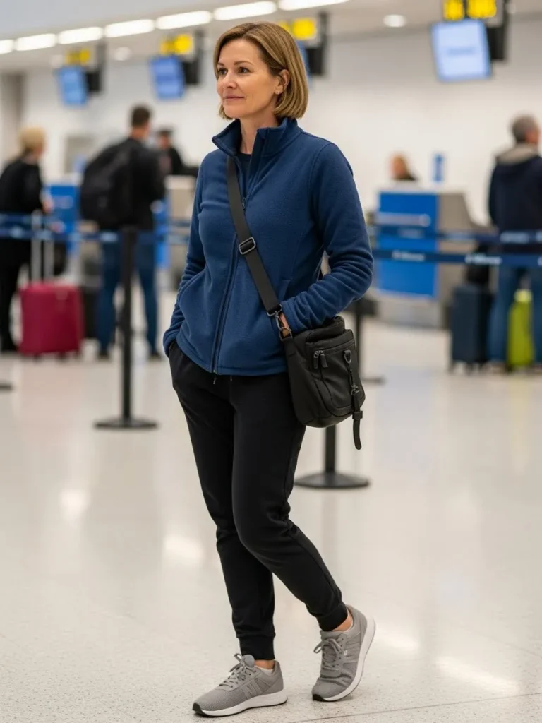 This outfit pairs a soft navy fleece zip jacket with classic black joggers for a warm and easy look that works perfectly in busy terminals. The lightweight crossbody bag keeps the essentials close and the grey sneakers add a sporty touch that makes long walks through the airport feel effortless. The whole vibe is practical and relaxed with a clean color palette that always looks good.