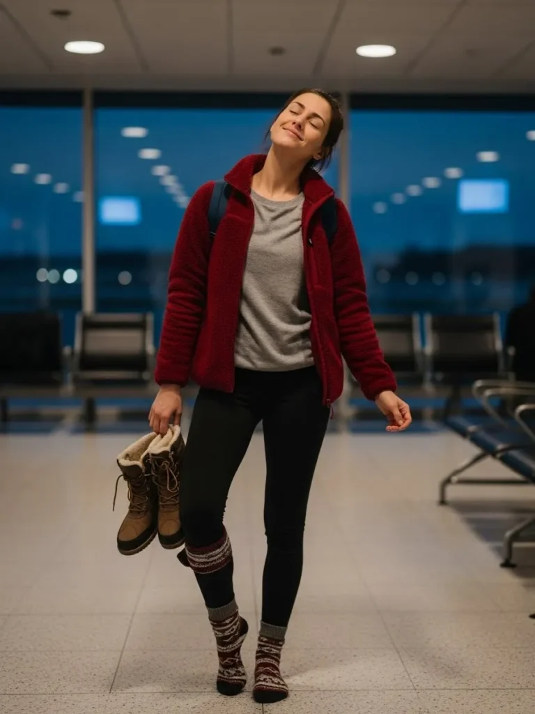 This outfit features a plush burgundy fleece jacket paired with black leggings and a simple gray tee. The chunky patterned socks bring in that cute winter travel touch and the warm boots in her hand show she is ready for colder weather on landing. Everything feels soft and relaxed which is exactly what a red eye calls for.