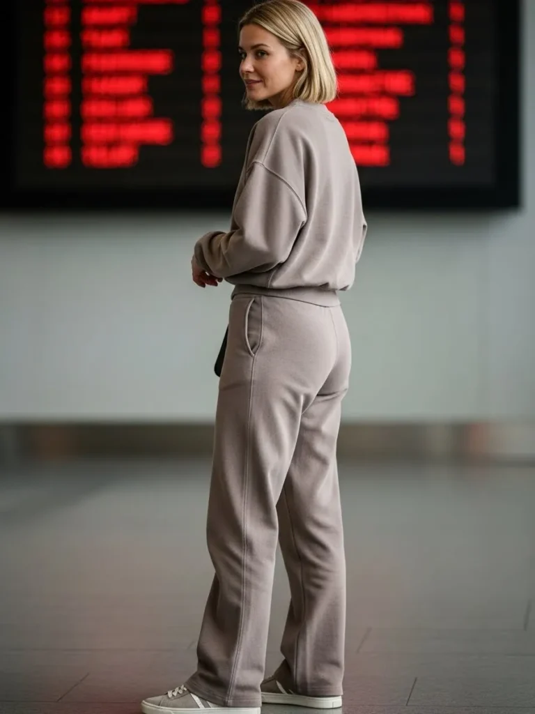 This soft taupe matching set pairs a relaxed sweatshirt with loose comfy pants for a clean minimal travel look. The smooth fabric looks soft and warm and the light sneakers keep everything comfortable for long walks through the terminal. The monochrome tones give it such a calm balanced vibe.