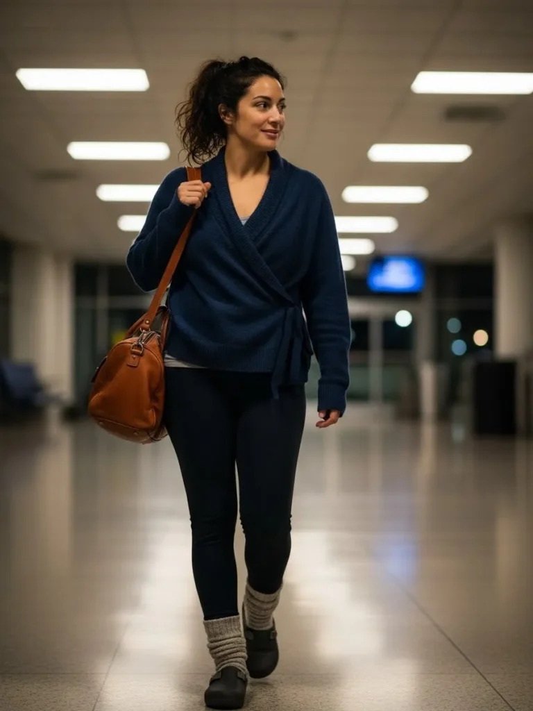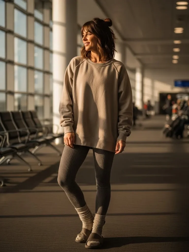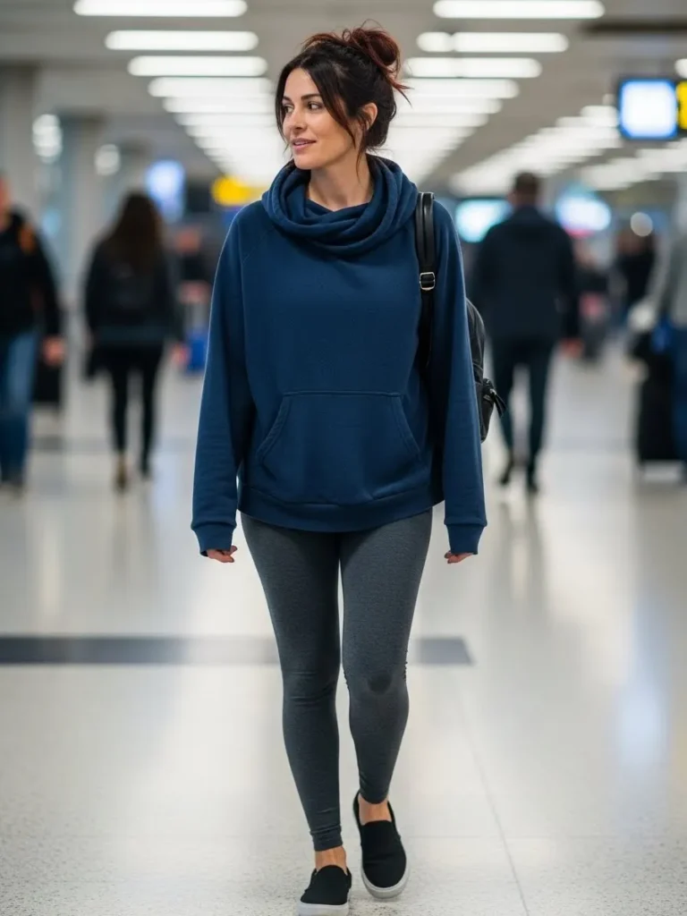 This comfy look features a slouchy navy pullover with a wide cozy neckline paired with charcoal gray leggings. The black slip on shoes keep things simple and the whole outfit feels lightweight but warm enough for a chilly terminal. It is the kind of look that makes moving through the airport feel effortless.