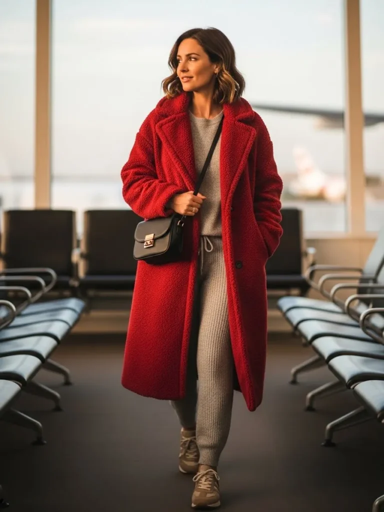 This outfit brings a bold moment to red eye travel with a bright red cozy coat layered over a soft gray knit lounge set. The beige sneakers keep things grounded while the structured black crossbody bag adds a polished touch. The coat steals the show in the best possible way and makes even the simplest knit pieces feel intentional.