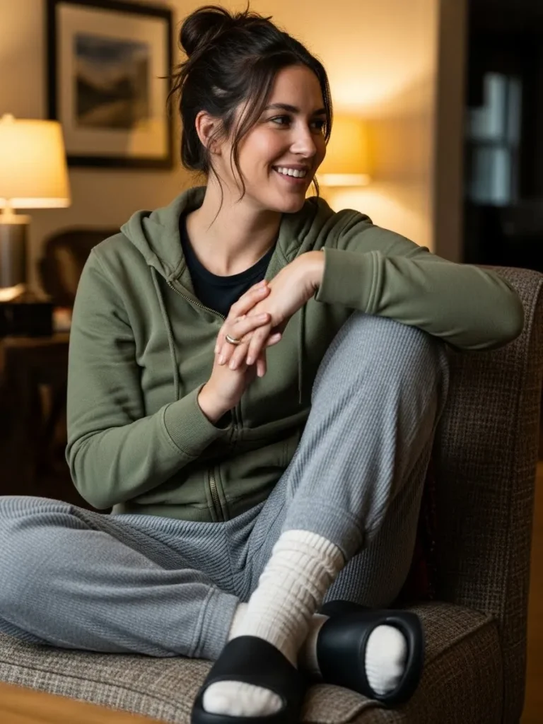 This outfit pairs an olive zip hoodie with a simple black tee and textured gray lounge joggers that look incredibly soft. The cozy socks and cushioned slide sandals add that relaxed at home feeling which somehow makes early travel mornings so much easier. The whole look feels warm and snuggly without trying too hard.
