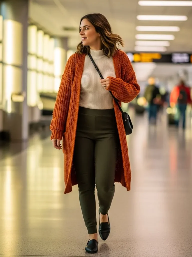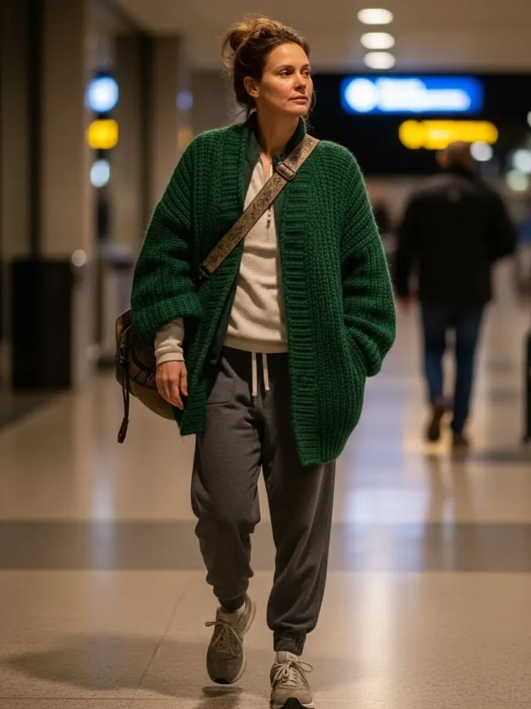 This outfit pairs a black fitted tee with olive joggers and a long chunky beige cardigan that feels perfect for cool airport air. The sneakers keep it practical and the combination of colors creates an earthy cozy palette that looks great in any season.