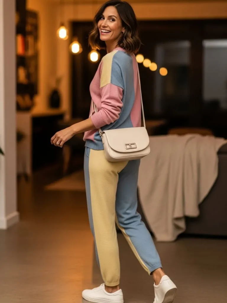 This bright cheerful look features a two piece knit set in pastel pink blue and buttery yellow. The soft sweater and matching joggers make the outfit feel playful and the white sneakers and white crossbody bag keep it clean and modern. It stands out in the sweetest way.