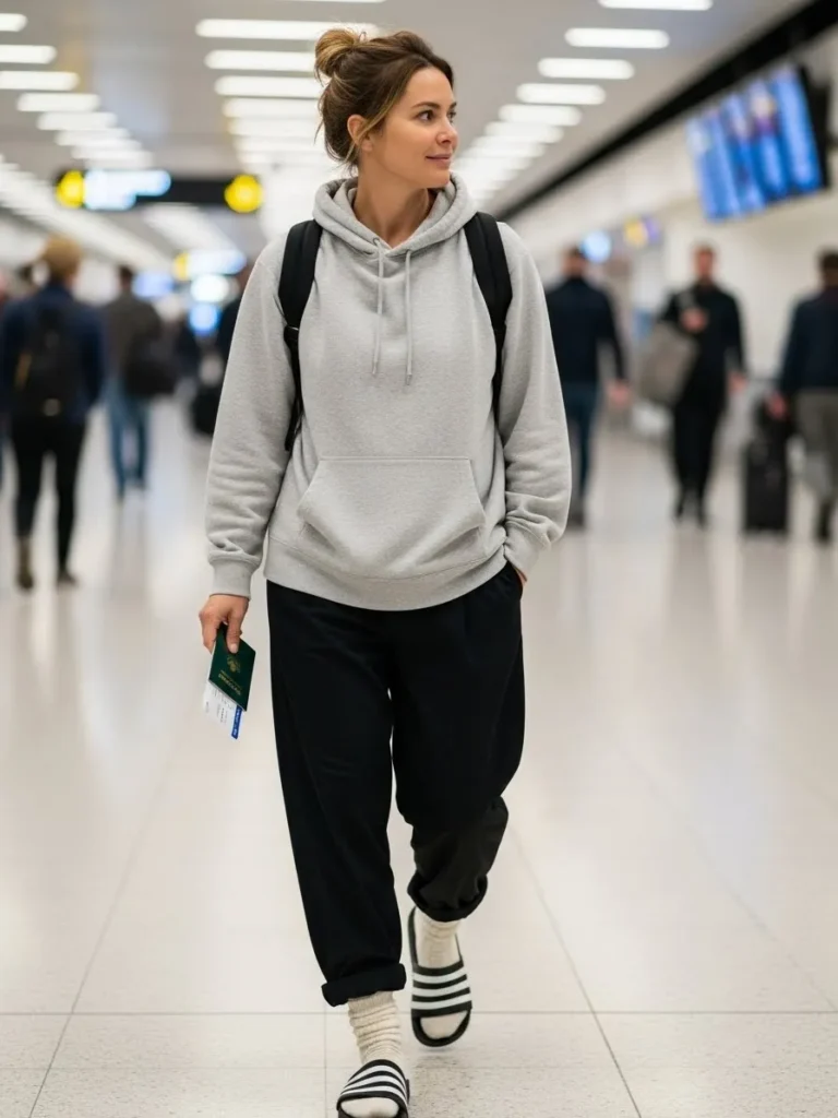 This relaxed outfit pairs a classic gray hoodie with loose black joggers and cozy socks tucked into sporty slide sandals. The backpack adds a practical touch and the whole look feels laid back and easy for long travel nights.