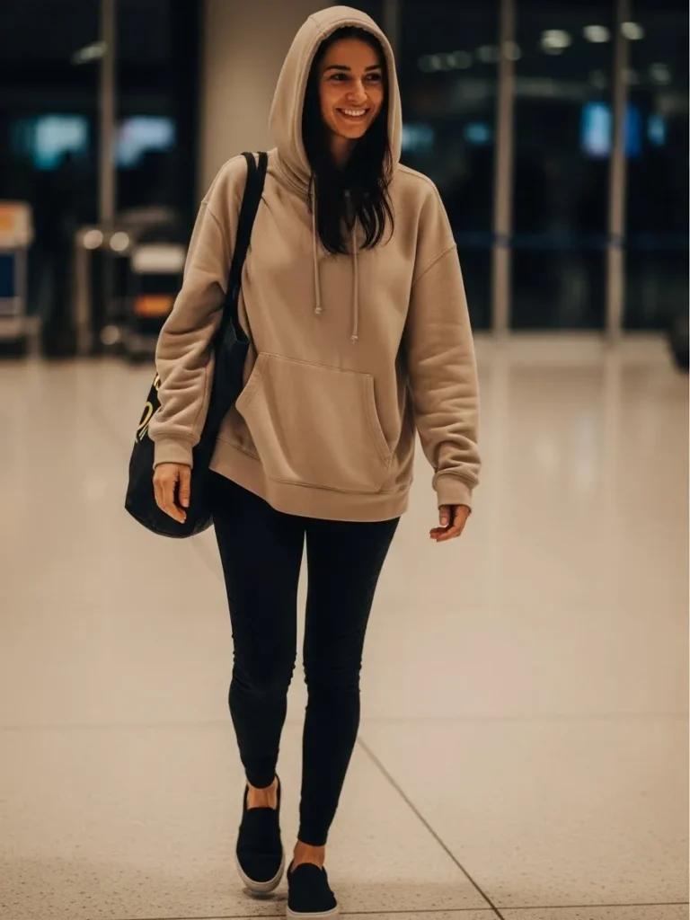 This look features an oversized taupe hoodie paired with sleek black leggings and black slip on shoes. The roomy black tote makes it easy to carry all the travel essentials. Everything feels simple neutral and easy which makes it perfect for early morning flights.