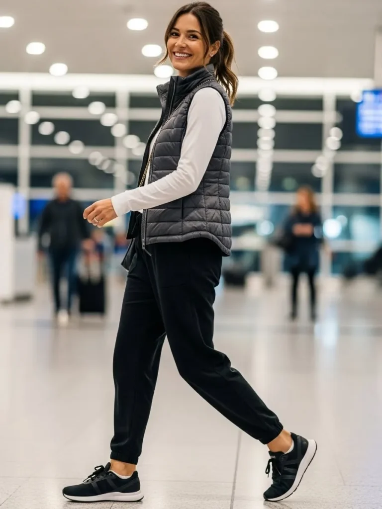 This outfit mixes a crisp white long sleeve top with black joggers and a gray quilted vest. It is sporty and lightweight with just enough warmth for chilly terminals. The sneakers tie everything together and keep the look clean and modern.