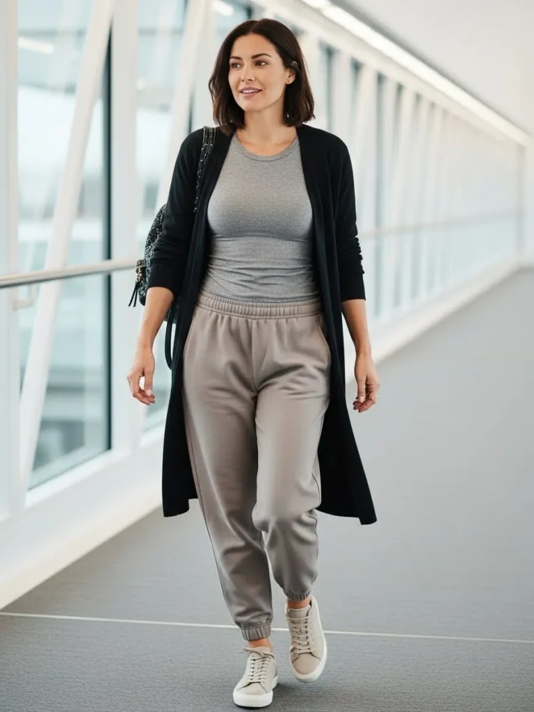 This outfit pairs a fitted gray tee with loose joggers in a soft taupe tone and a long black cardigan. The mix of fitted and flowy pieces creates a relaxed balanced look. Sneakers keep it practical and the long cardigan adds just enough warmth for the plane.