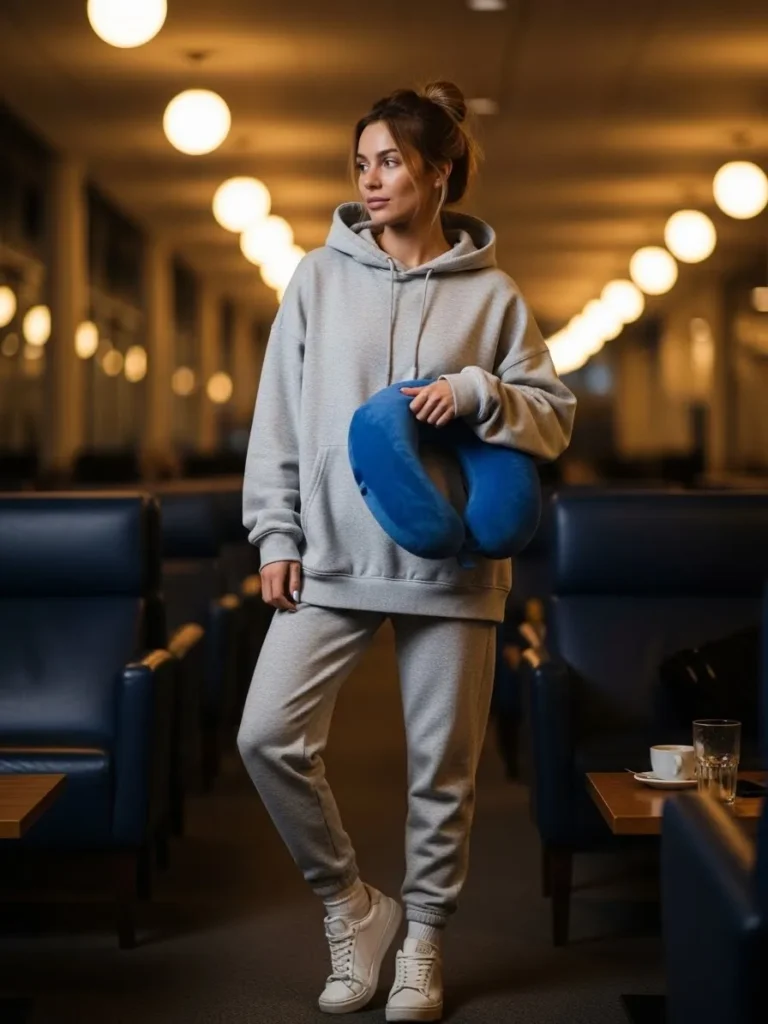 This outfit is all about soft comfort with an oversized gray hoodie and matching joggers that look warm without feeling bulky. The white sneakers keep things fresh and simple while the bright blue travel pillow adds a fun pop of color. The whole look gives that relaxed early morning energy that feels perfect for a red eye.