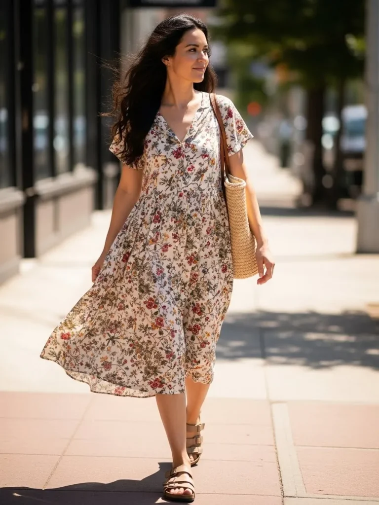 This breezy travel outfit features a soft floral midi dress with lightweight fabric that moves beautifully. Simple sandals and a woven tote give it an easy summery feel that works perfectly for warm destinations. The floral print keeps everything playful and feminine.