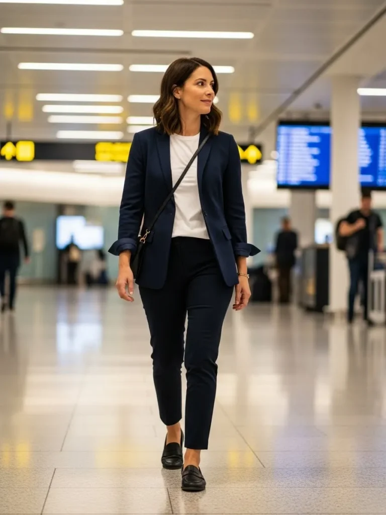 This chic airport outfit features a navy blazer layered over a white tee with slim navy trousers and black loafers. The look is tailored in a relaxed way that feels polished but still comfortable. The matching tones make it cohesive and effortlessly stylish for flying or work trips.