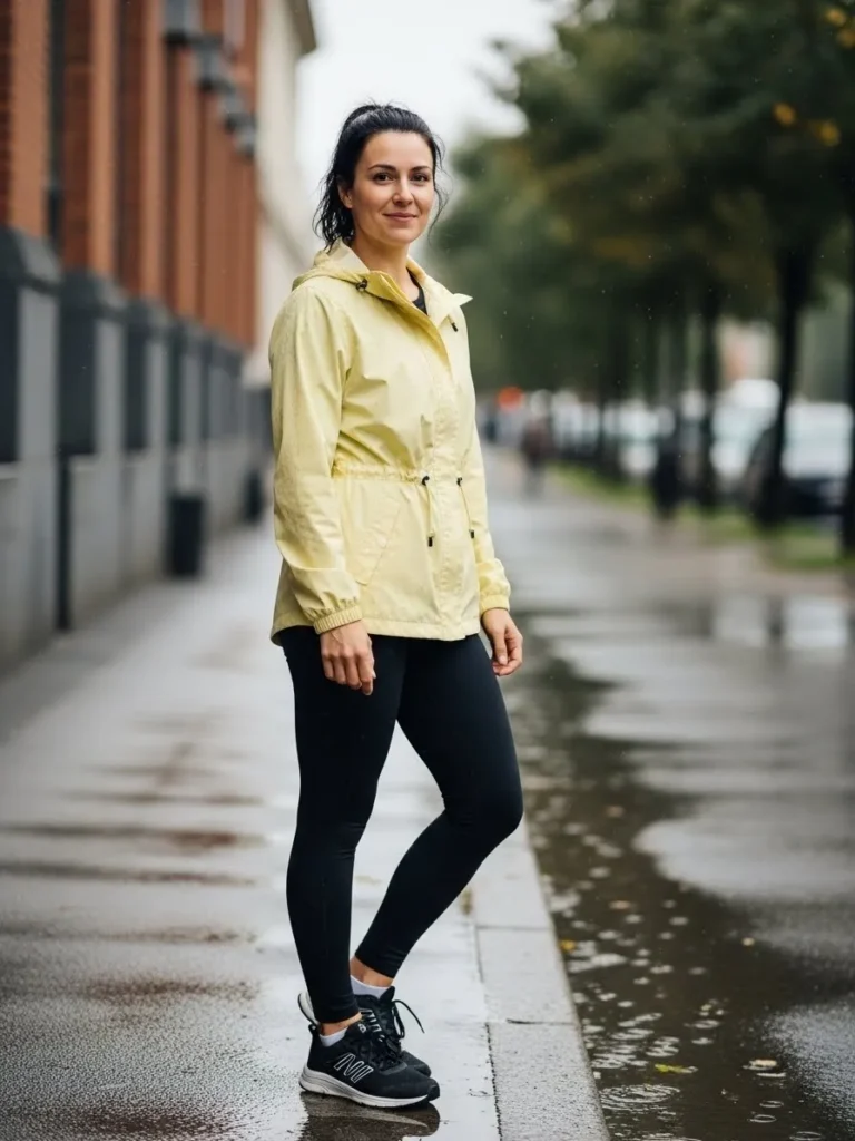 This travel friendly look features a pale yellow rain jacket layered over a black top with sleek black leggings and running shoes. The outfit looks ready for sudden weather changes while still staying light and simple. The pop of color from the jacket makes the whole look feel cheerful even on rainy days.