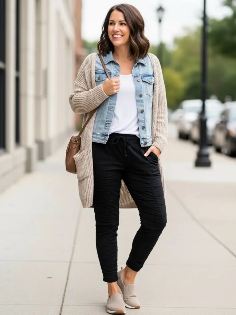 This look mixes a white tee with a light denim jacket and a long beige knit cardigan on top. Paired with black joggers and soft neutral slip-ons it has the perfect balance of comfort and structure. The layered textures feel practical yet cute and the colors make the whole outfit feel fresh and easy.