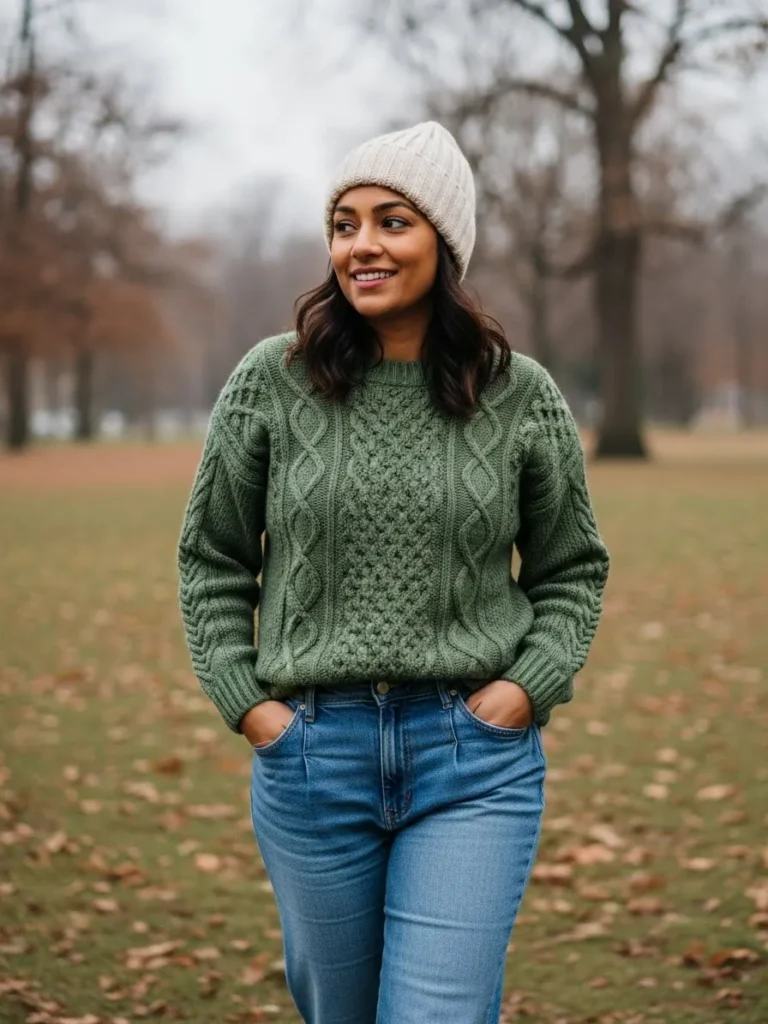 This cozy outfit features a chunky green cable knit sweater paired with classic blue jeans and a soft beige beanie. The knit details add texture and warmth while the jeans keep everything timeless and easy. It feels perfect for cold destinations or brisk morning travel.