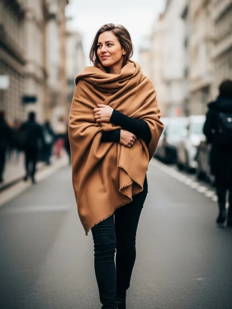 This outfit centers on a beautiful camel shawl draped over a fitted black top and slim black pants. The wrap adds instant warmth and gives the whole look a soft elegant feel. The color combination is classic and the silhouette stays sleek even though the shawl adds a touch of drama.
