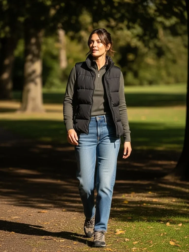 This outfit pairs a lightweight black puffer vest with a dark zip pullover, straight blue jeans and sturdy walking shoes. The mix feels practical and outdoorsy while still looking clean and streamlined. The cozy layers make it perfect for cool mornings or long travel days that include lots of walking.