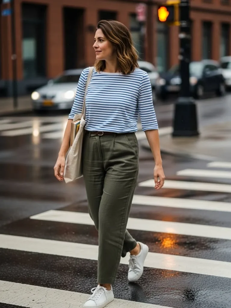 This classic travel outfit includes a blue striped boatneck tee tucked into soft olive trousers. White sneakers and a canvas tote complete the look in a way that feels casual clean and very French inspired. The colors stay soft and easy which makes the whole outfit feel wearable in almost any destination.