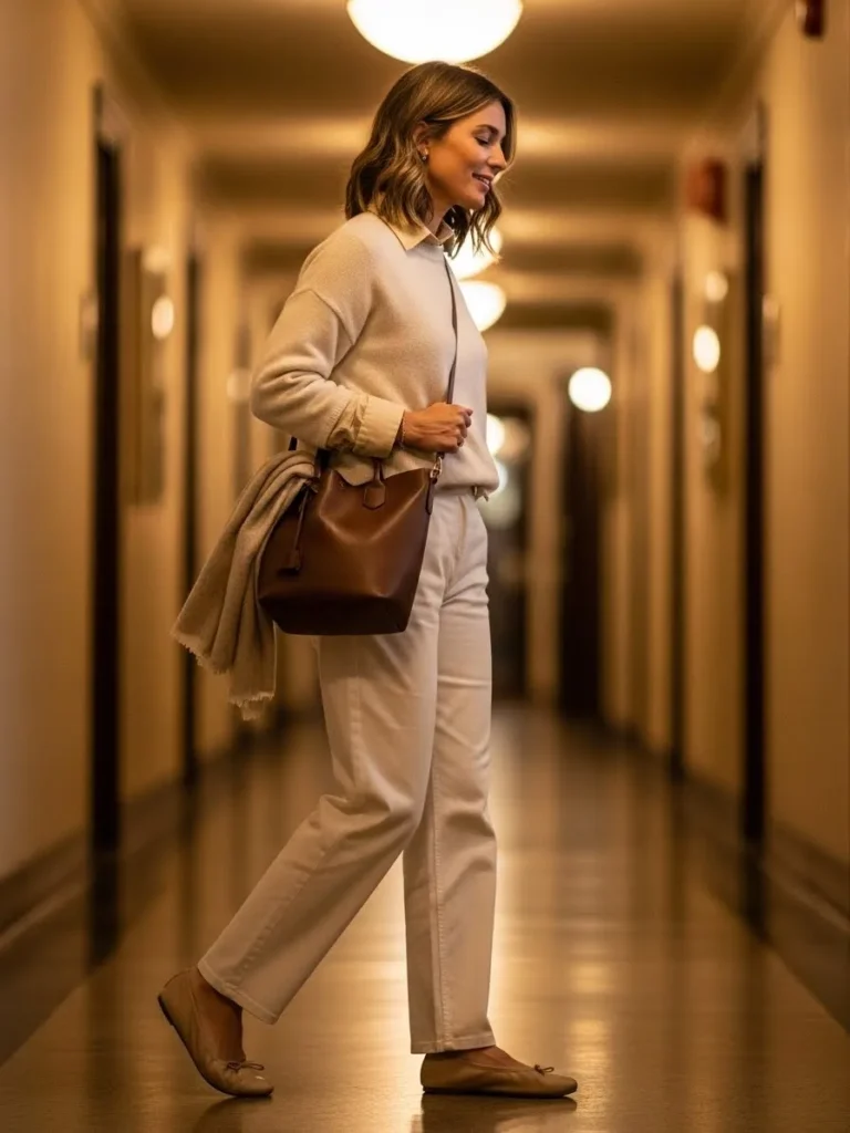 This look leans into soft neutrals with an off white sweater tucked into matching straight leg pants. Beige flats keep everything gentle and minimal while a warm brown leather bag adds a little contrast and depth.