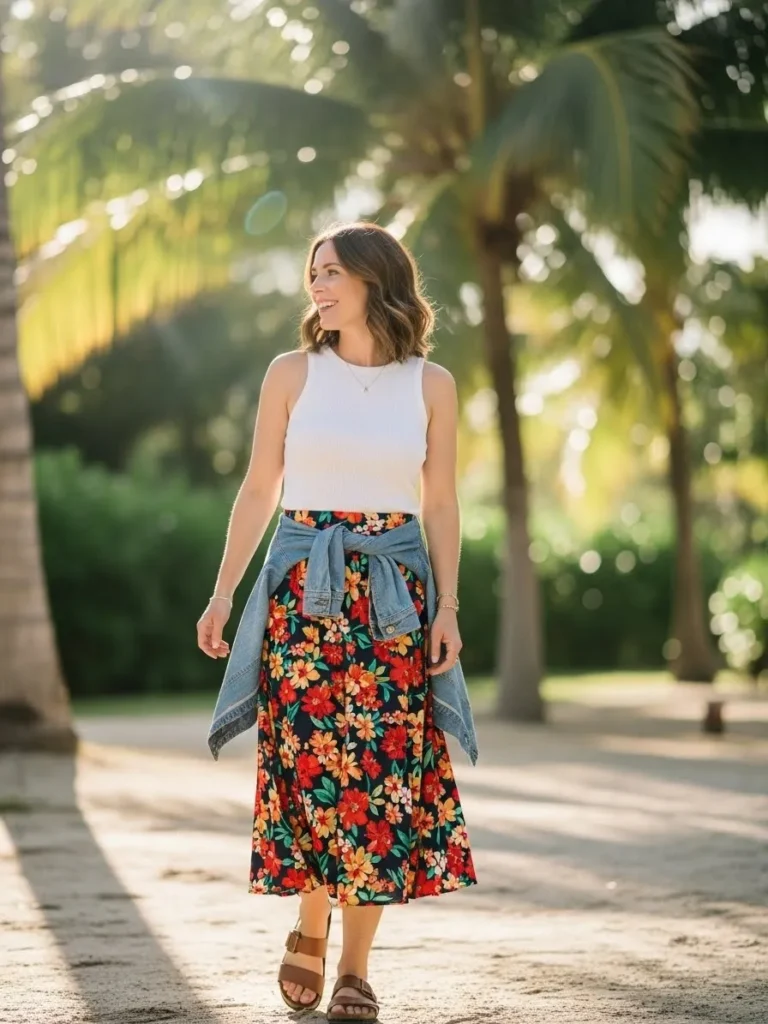 This bright travel outfit features a colorful floral midi skirt styled with a simple white sleeveless top. A denim jacket is tied around the waist which adds a casual touch and brown sandals complete the warm weather mood.