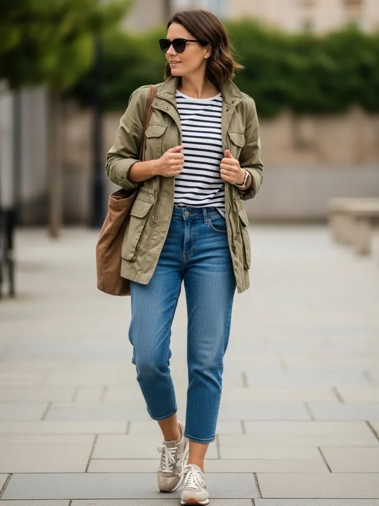 This outfit combines a striped tee with a lightweight olive utility jacket and cropped blue jeans. Beige sneakers and dark sunglasses finish the look and give it a cool laid back vibe that is perfect for city travel.