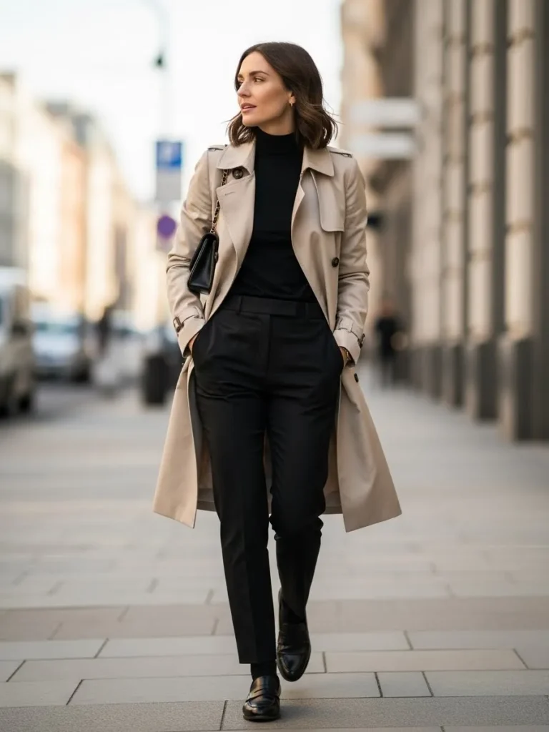 This outfit pairs a timeless beige trench with a black turtleneck and tailored black trousers. Shiny black loafers keep everything sleek and a small black shoulder bag adds a polished touch. The whole look feels clean and structured which makes it perfect for city travel.