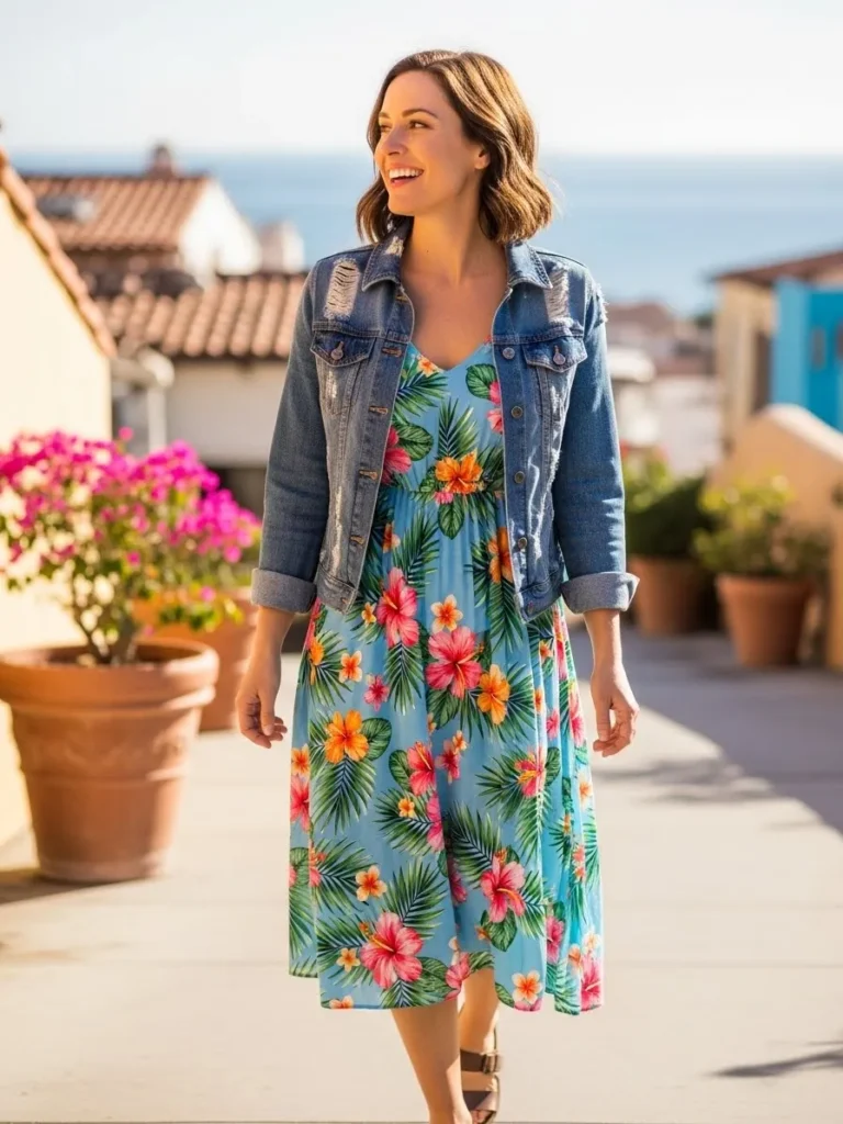 This cheerful outfit features a light blue dress covered in bold tropical florals and layered with a slightly distressed denim jacket. The easy sandals add to the relaxed vibe and the sunny backdrop makes the colors pop even more.