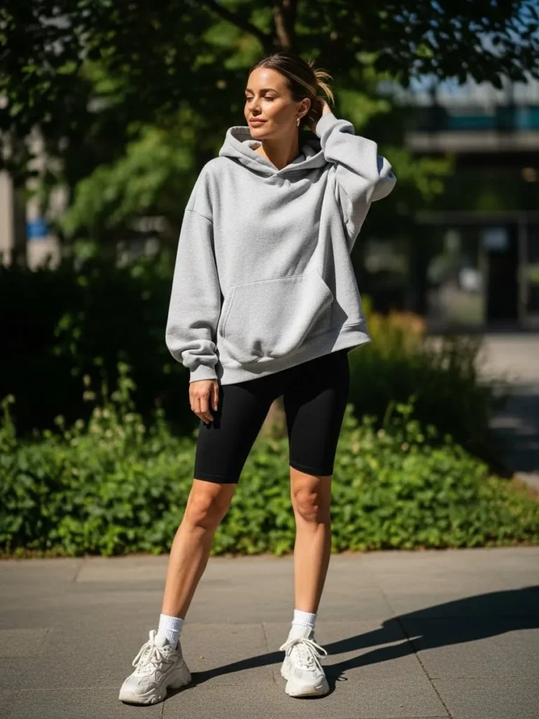 This sporty look brings together a slouchy gray hoodie with simple black bike shorts. Chunky white sneakers give it that comfy active feel and the whole outfit looks perfect for walking around on a sunny day.