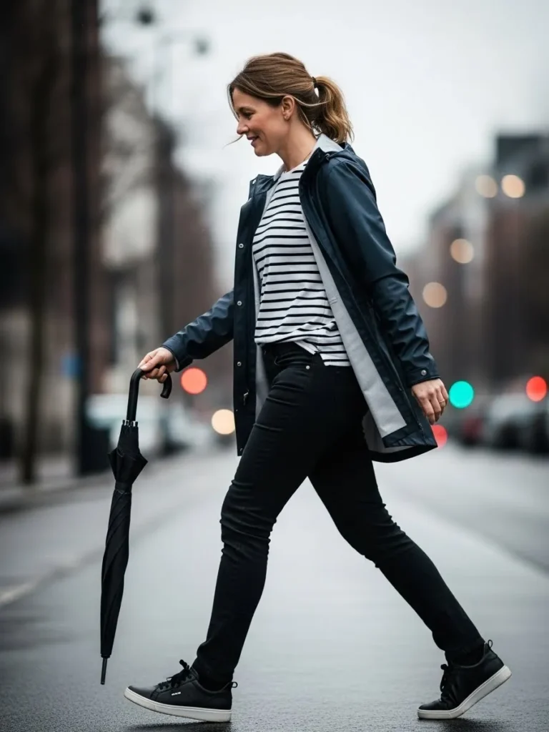This outfit pairs a navy rain jacket with a striped tee and slim black jeans. Simple black sneakers finish the look while a black umbrella keeps the theme practical. It is a classic rainy day travel outfit that still looks cute.
