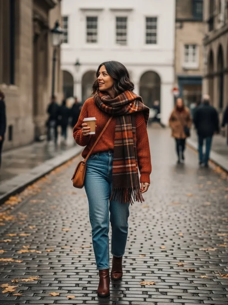 This outfit brings together a warm rust sweater with a long plaid scarf in earthy tones. Light blue jeans keep things classic while brown ankle boots and a small tan crossbody bag tie the whole look together. The colors feel cozy and seasonal which makes it perfect for a crisp fall stroll with a hot drink in hand.