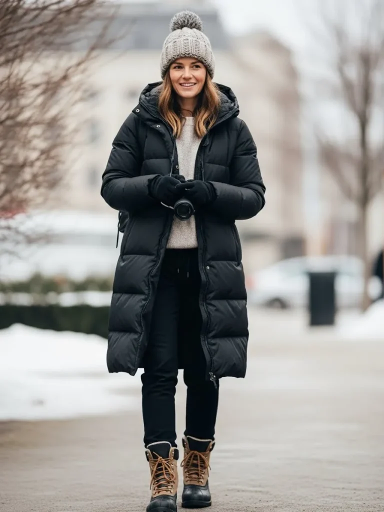 This winter outfit features a long black puffer coat paired with a soft beige sweater and fitted black pants. The chunky knit hat with a pom pom adds a playful touch and the sturdy winter boots keep things practical. Gloves complete the look and make it ready for snowy streets.