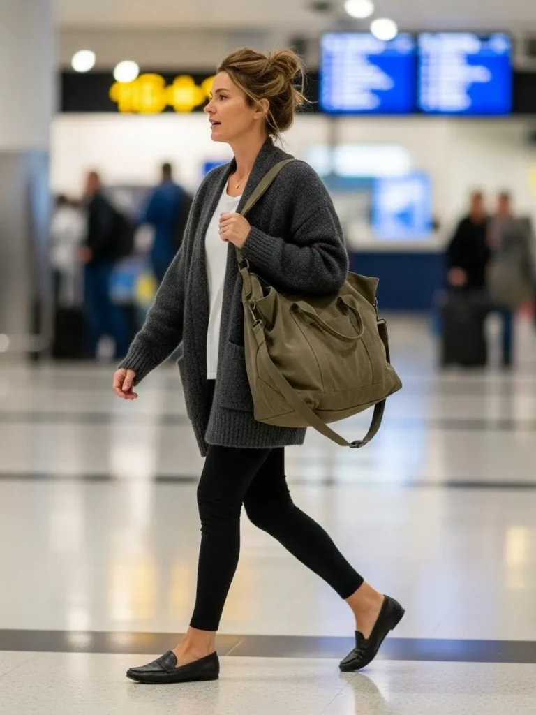 This outfit is all about soft comfort with a relaxed charcoal cardigan layered over a simple white tee, paired with classic black leggings that keep everything sleek and easy. The look is finished with black flats that make airport walking painless and a roomy olive tote that feels practical without losing style. The whole vibe is calm and effortless, like someone who knows how to travel without stress.
