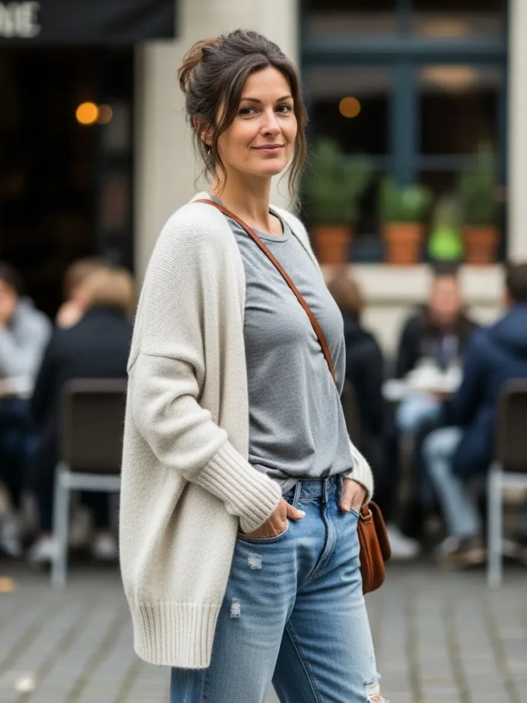 This outfit brings together a loose ivory cardigan layered over a simple grey tee and paired with relaxed distressed jeans. The soft textures make the whole look feel cozy while the crossbody bag adds a small touch of polish. Everything about this outfit feels easy and comfortable which makes it perfect for casual travel days and café stops.