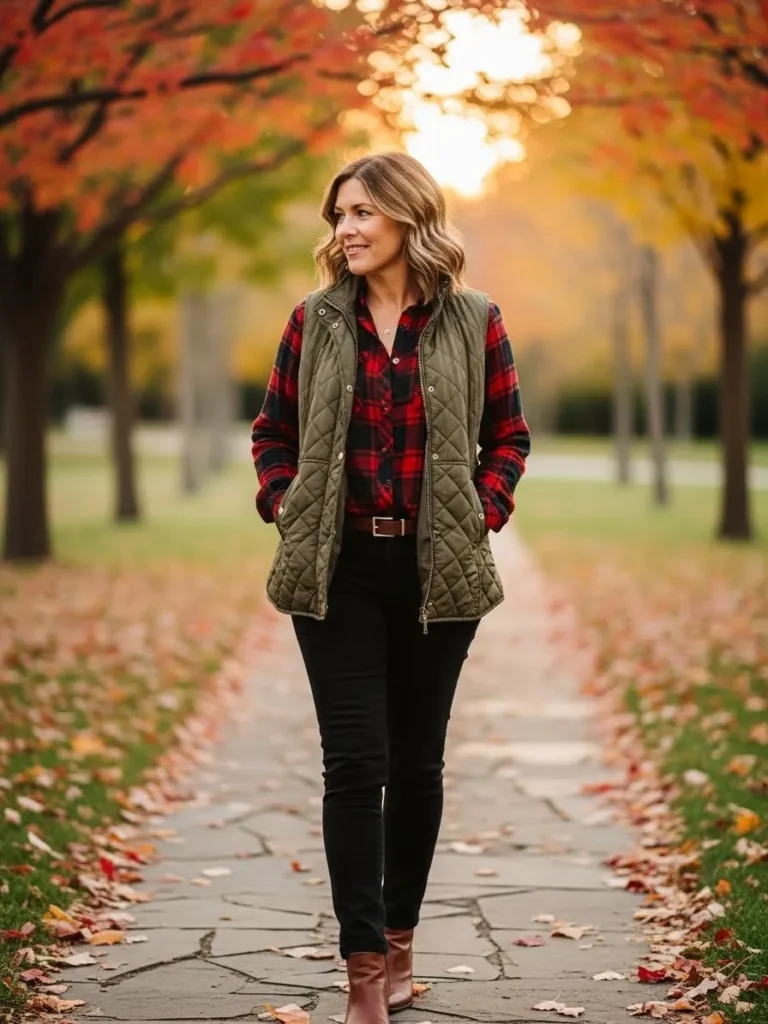 This outfit mixes a quilted olive vest with a red and black flannel shirt and fitted black pants. Brown ankle boots warm up the look and the colors blend perfectly with crisp autumn scenery. The vibe feels outdoorsy relaxed and perfect for cool weather exploring.