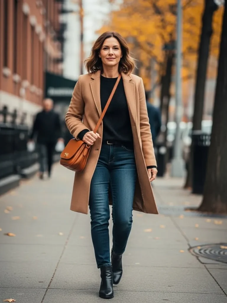 I love how a camel coat always makes everything look elevated without trying. It gives structure while the jeans keep it grounded and practical. The mix of tones feels so classic and always puts me in a confident mood when I am exploring a new city.
