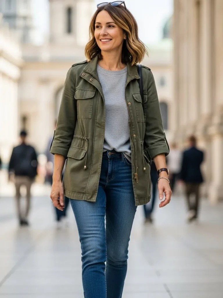 This look features an olive utility jacket layered over a soft grey top and paired with medium wash jeans. The jacket adds texture and personality while still being incredibly practical with all the pockets. The jeans keep the outfit easy and the subtle accessories make the look feel relaxed and unfussy.