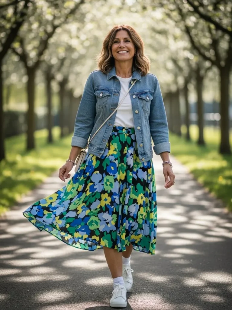 This outfit blends a bright floral midi skirt with a classic white tee and a light denim jacket for an upbeat, breezy look. White sneakers keep the outfit grounded and give it a playful finish. The mix of colors and prints creates a cheerful feel that works beautifully for spring or summer travel days.