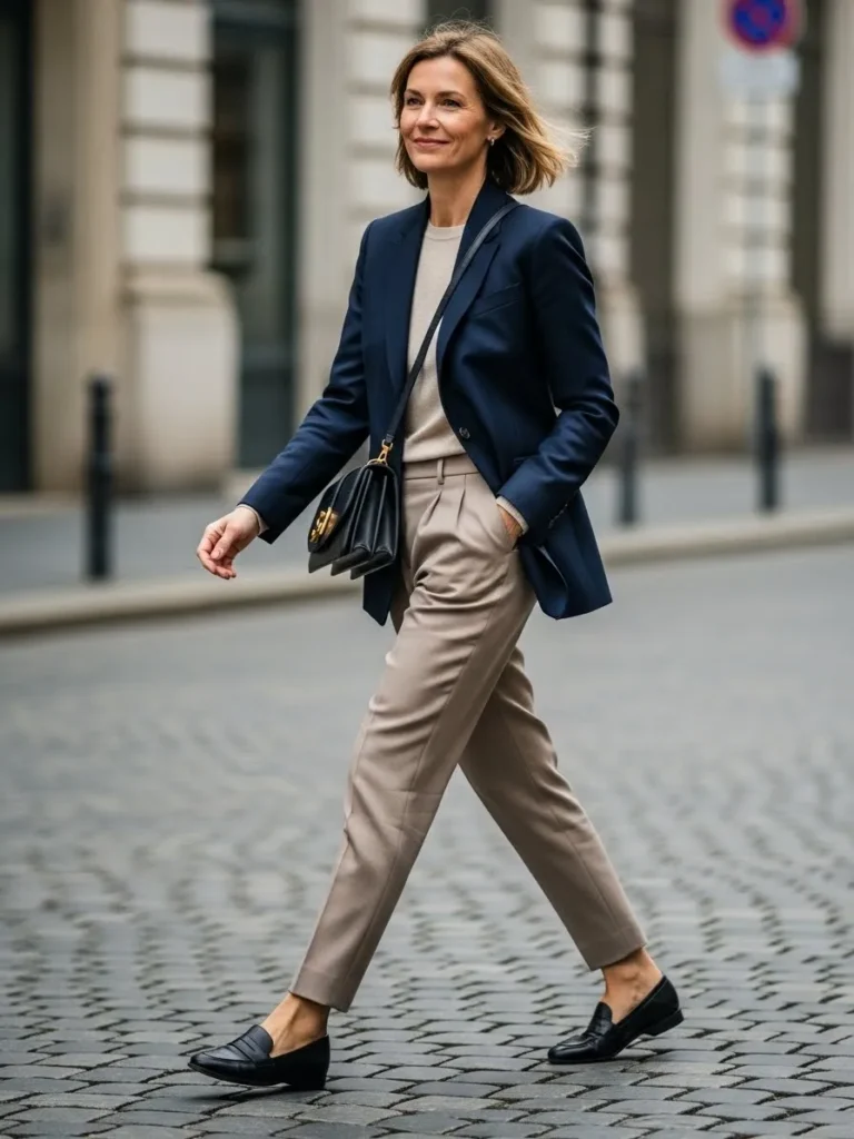 This outfit blends a navy blazer with a soft beige sweater and tailored taupe trousers for a look that feels sharp without being fussy. Black loafers keep things sleek and comfortable and the structured crossbody bag adds a classic finishing touch. The whole outfit gives a polished city feel while staying practical enough for a travel day.