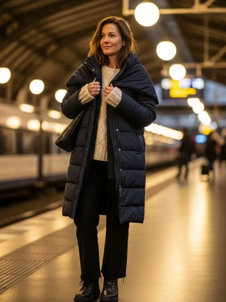 I always reach for long coats like this when temperatures drop because they make me feel wrapped up without losing style. The sweater adds that comfy winter feeling and the boots keep everything practical for slippery platforms or busy train stations. It is the kind of outfit that makes cold weather travel feel easier.