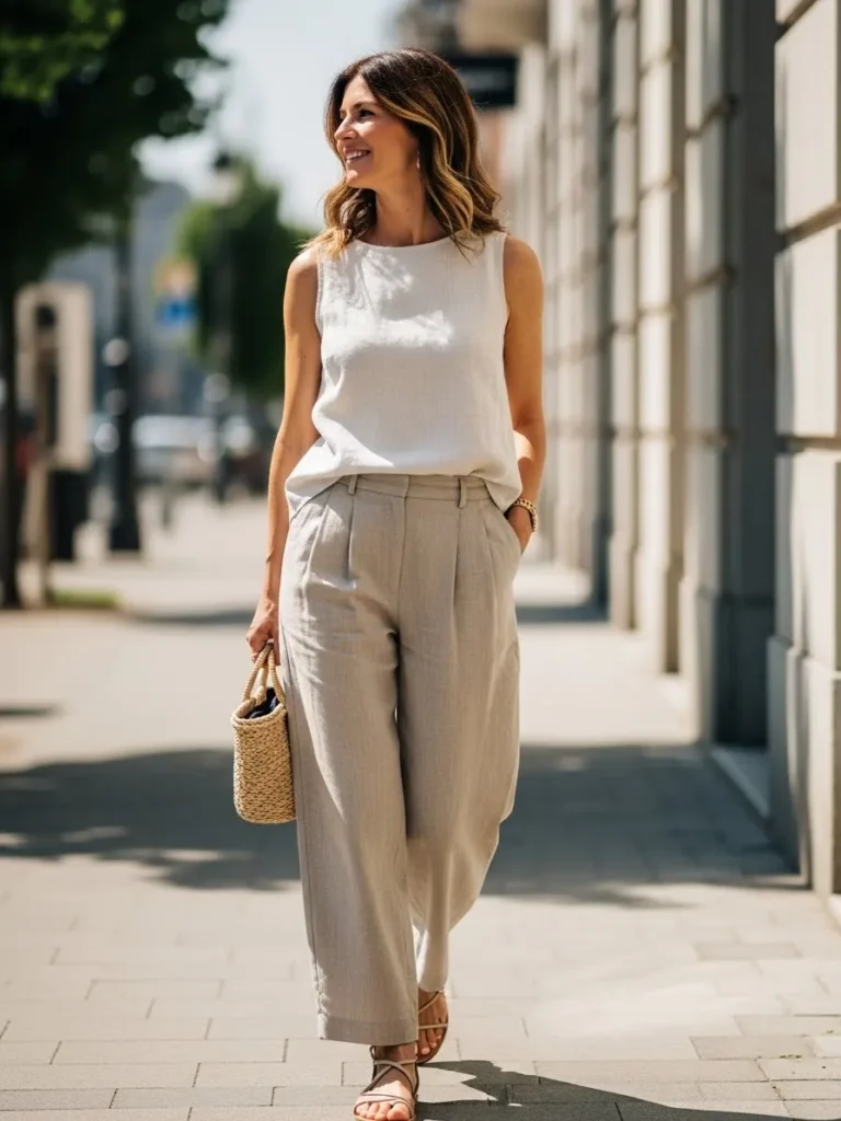 This outfit brings together a breezy sleeveless white top and relaxed light beige trousers with a soft pleated shape. Neutral strappy sandals keep the look easy and the woven handbag adds a warm natural texture. The whole outfit feels light and fresh which makes it great for warm destinations or sunny sightseeing days.