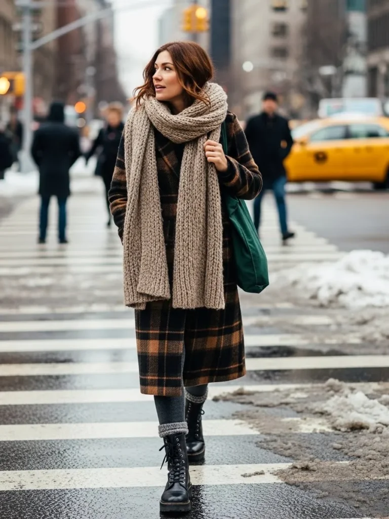 This outfit mixes a long plaid winter coat in warm brown tones with thick grey tights and lace up black boots. The oversized taupe scarf adds so much texture and looks incredibly soft. The colors feel earthy and grounded which makes it perfect for a snowy city day. The green tote adds a fun surprise that gives the whole look a relaxed traveler vibe.