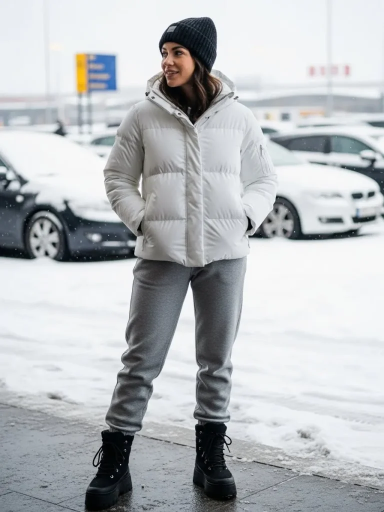This look is all about comfort with a crisp white puffer jacket paired with soft grey joggers. The black beanie and chunky lace up boots keep everything practical for snowy sidewalks. The outfit stays simple and clean with a soft neutral palette that feels winter fresh. The pieces move easily which makes the outfit great for long travel days.