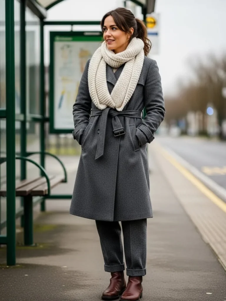 This outfit brings elegance with a belted grey wool coat layered over matching grey trousers. The cream knit infinity scarf adds a soft contrast and looks so warm. Burgundy ankle boots give the whole look a rich touch that feels perfect for colder months. The coordinated tones make it peaceful and polished at the same time.