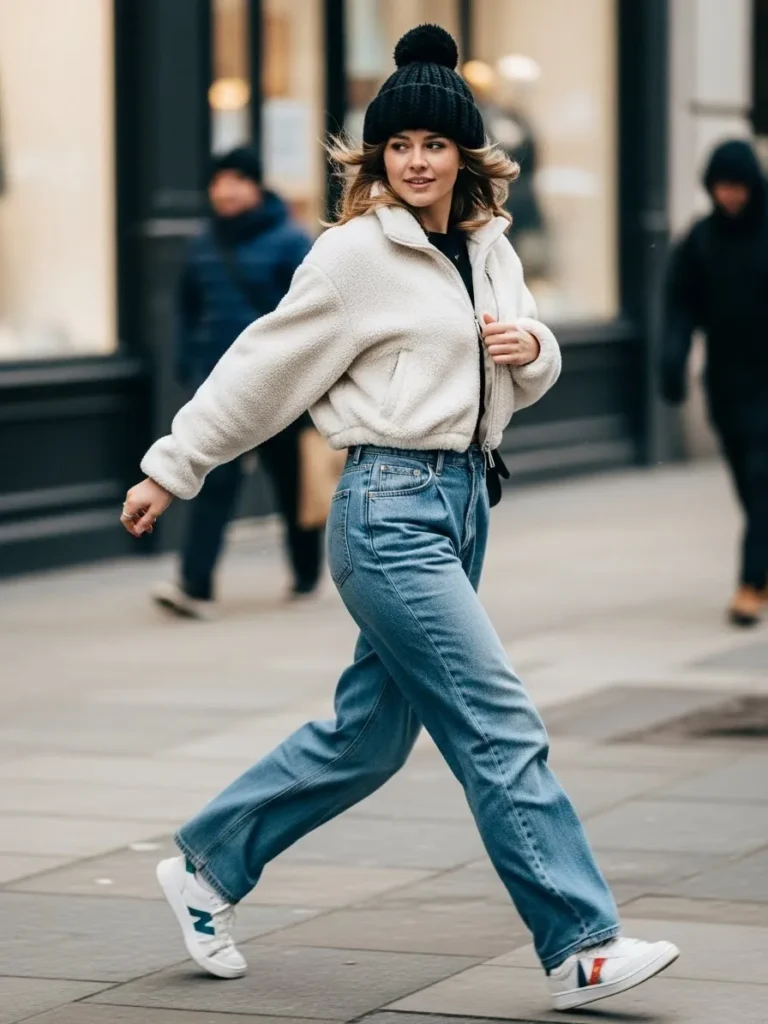 This outfit combines a soft white teddy zip jacket with light blue jeans for a comfy casual winter feel. The black beanie with a pompom adds a playful touch and the white sneakers keep the look bright and fresh. The jacket’s texture gives everything that cozy aesthetic that makes winter layering fun.