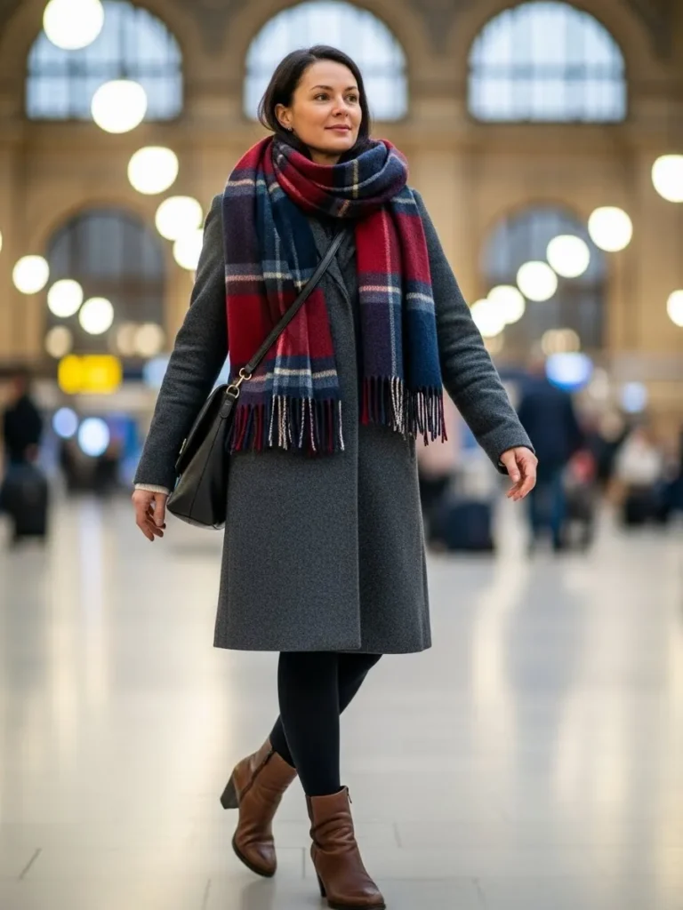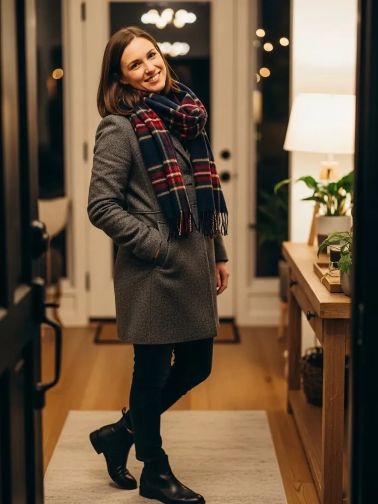 A tailored grey wool coat paired with slim black pants creates a simple and polished base. The plaid scarf pops with rich winter colors and brings personality to the whole look. Black ankle boots keep the silhouette clean and classic. The soft indoor lighting adds an inviting warmth that makes the outfit feel calm and stylish.