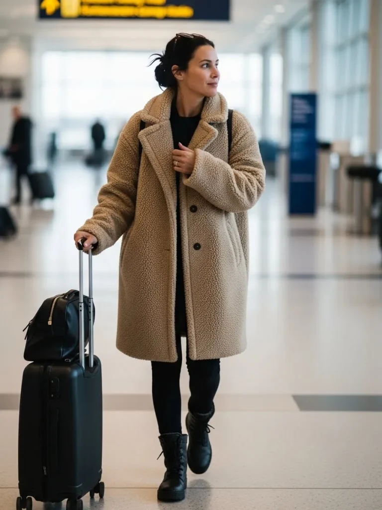 I reach for teddy coats on cold travel days because they give me a little hug the whole time. The black base layer keeps everything sleek and I love how the coat instantly softens the vibe. It is practical and cute which always makes winter travel feel easier.