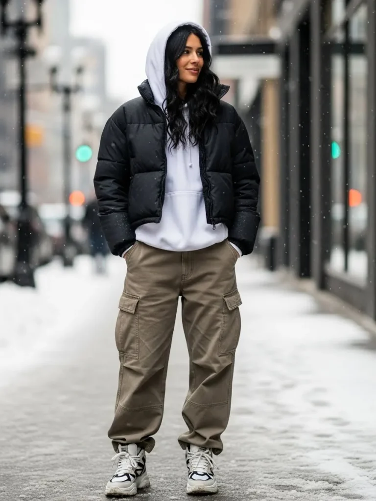 This outfit uses a cropped black puffer jacket layered over a white hoodie for that warm street inspired mix. The light tan cargo pants add a relaxed shape and the chunky white sneakers keep everything sporty. The whole look feels easy and comfortable with fabrics made for movement and layering. The snow in the background makes the outfit feel even cozier.