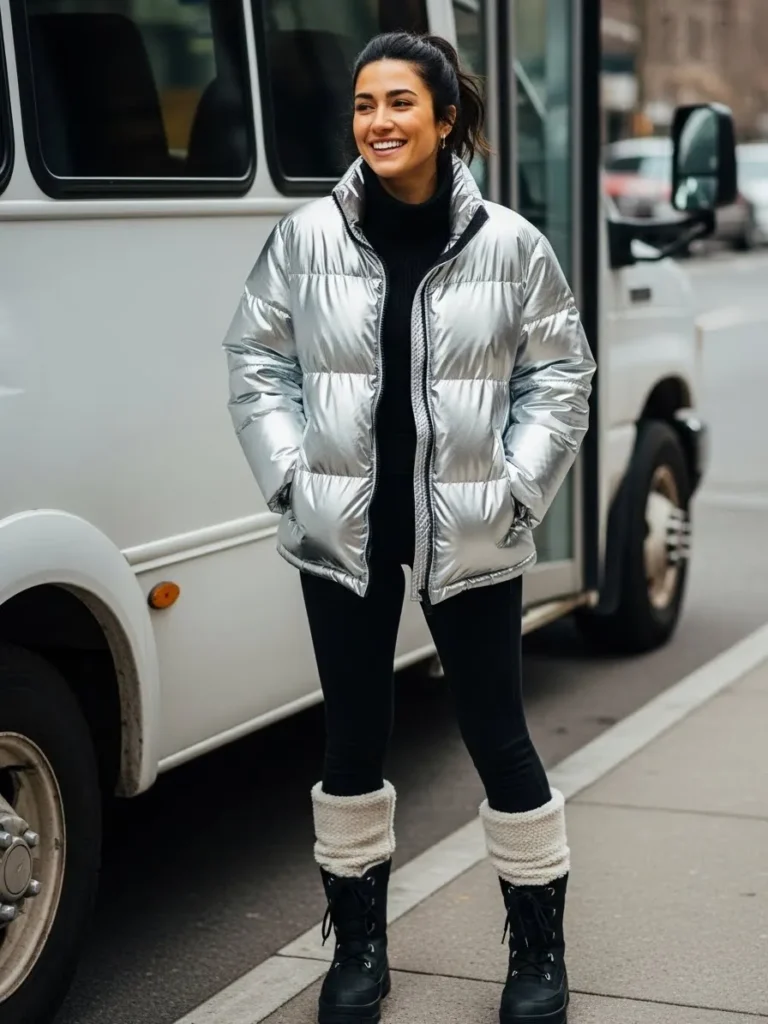 This outfit brings fun energy with a shiny silver puffer jacket layered over a black turtleneck and black leggings. The jacket is bold but still practical and the leggings keep everything sleek. The tall winter boots with soft cream cuffs add warmth and a cute touch that balances the metallic shine. The mix of textures makes the outfit feel playful and perfect for cold days on the move.