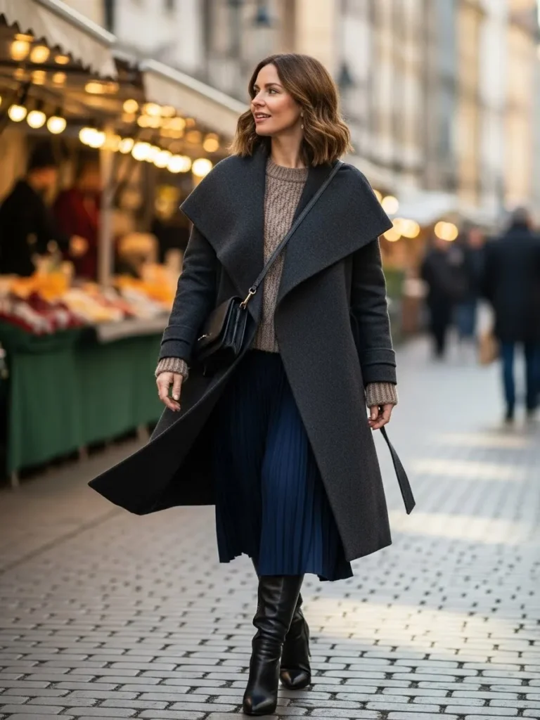 This look blends structure and softness with a wide lapel charcoal coat layered over a chunky knit sweater. The navy pleated skirt adds movement and pairs beautifully with tall black boots. The dark crossbody bag keeps the outfit polished and travel friendly. Everything works together through rich winter textures and a calm neutral palette.